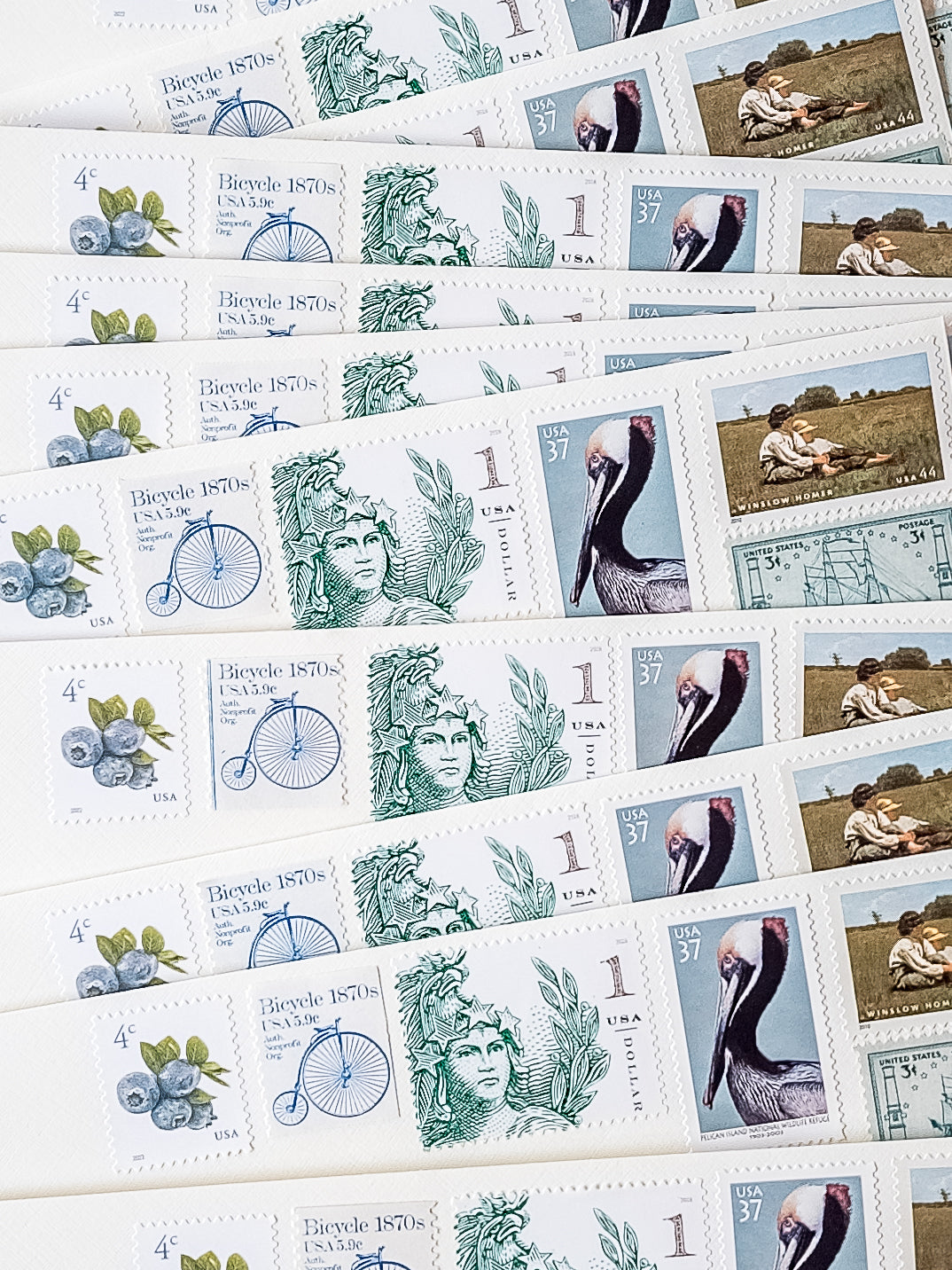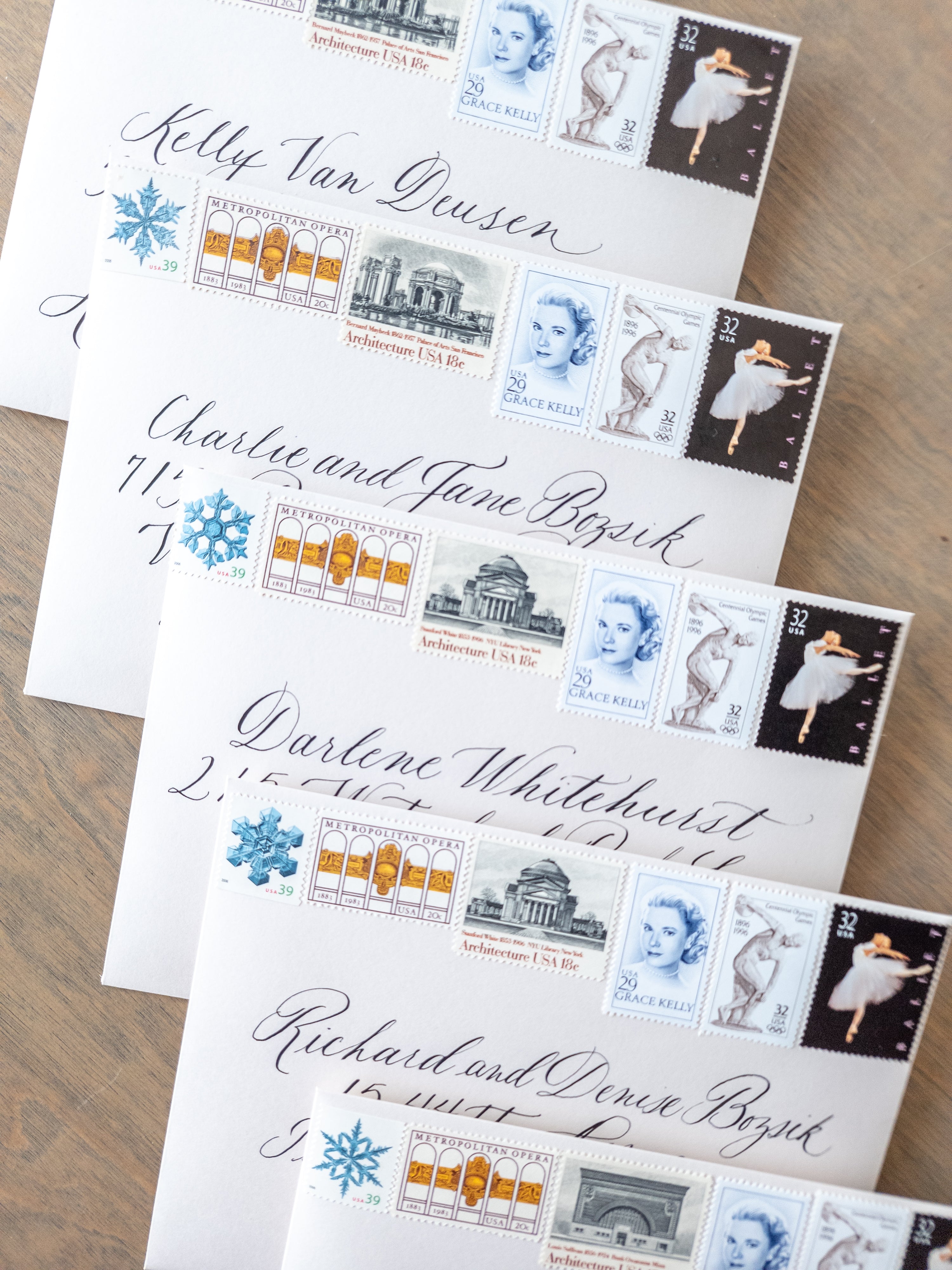 Curated vintage postage tells a story from your wedding location, colors and personal details.